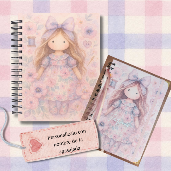 Un cuaderno personalizado con el nombre de la agasajada. Tamaño A5 de 100 hojas, ilustradas, cuadriculadas y lisas.